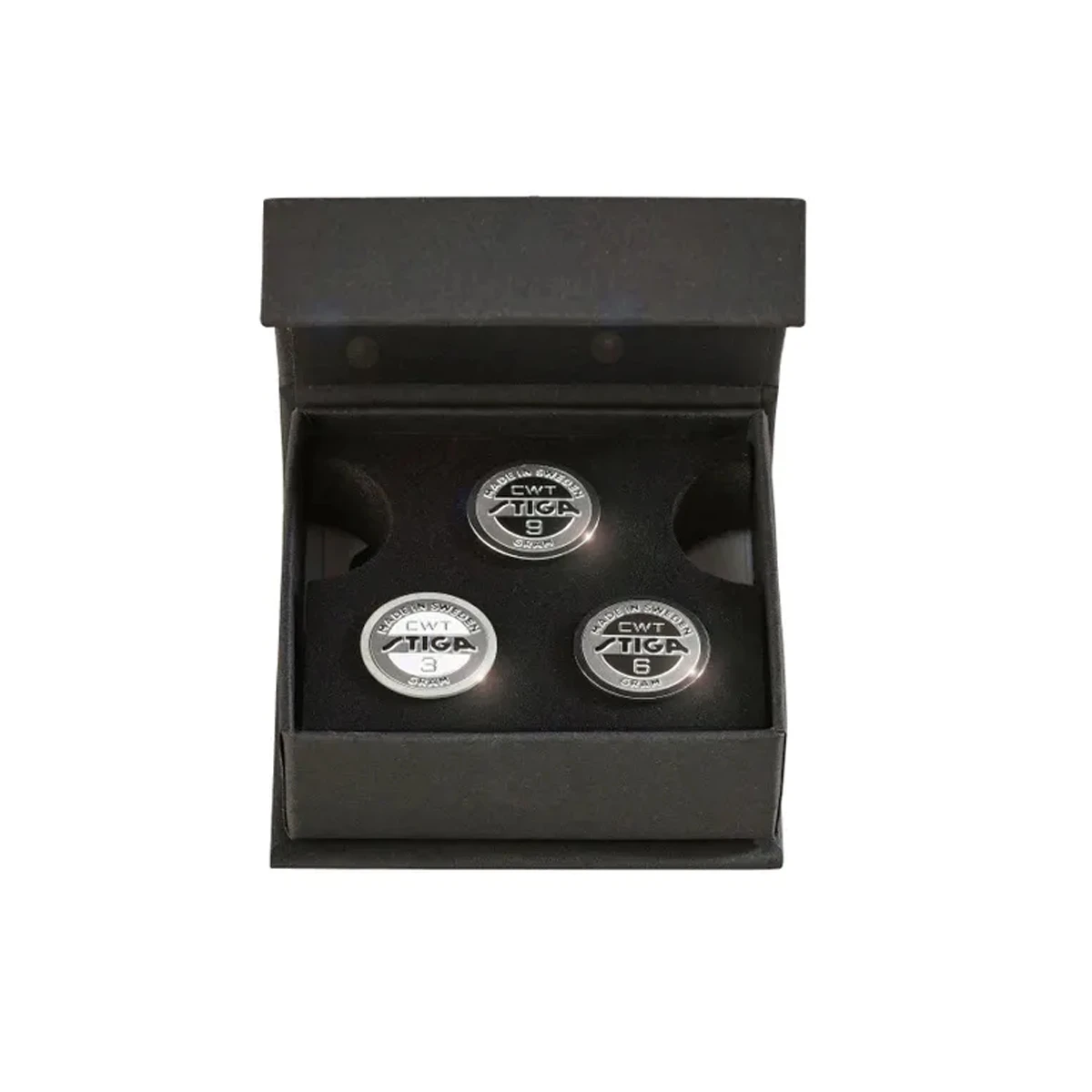- Die Innovation STIGA Custom Weight Technology, um Gewicht und Schwerpunkt des Blattes mit drei Gewichten von 3, 6 und 9 Gramm einzustellen, die mit Hilfe eines Magneten im Blatt problemlos an der Unterseite des Griffs befestigen können, um die für Sie perfekten Eigenschaften Ihres STIGA-Blattes zu erreichen. Lesen Sie weiter unten auf dieser Seite mehr über die STIGA „Custom Weight Technology“!